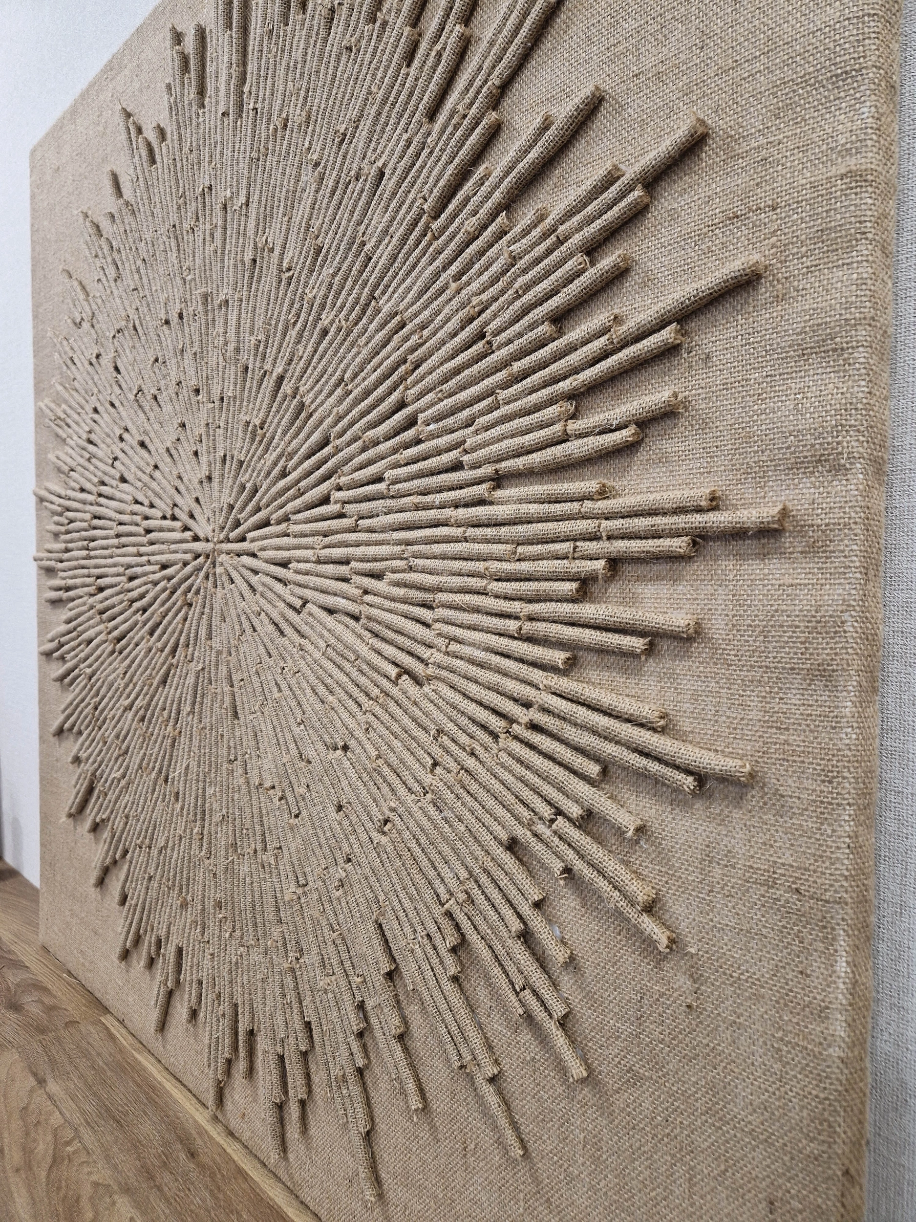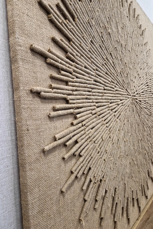 The artwork titled “Sun” is a unique piece that celebrates the majesty and energy of the central star in our solar system. Inspired by the sun’s rays, this handcrafted piece made from jute fabric brings a unique warmth and natural glow into any space. The composition of radiating jute elements resembles glowing sun rays spreading out from a central point, symbolizing both energy and universal harmony.