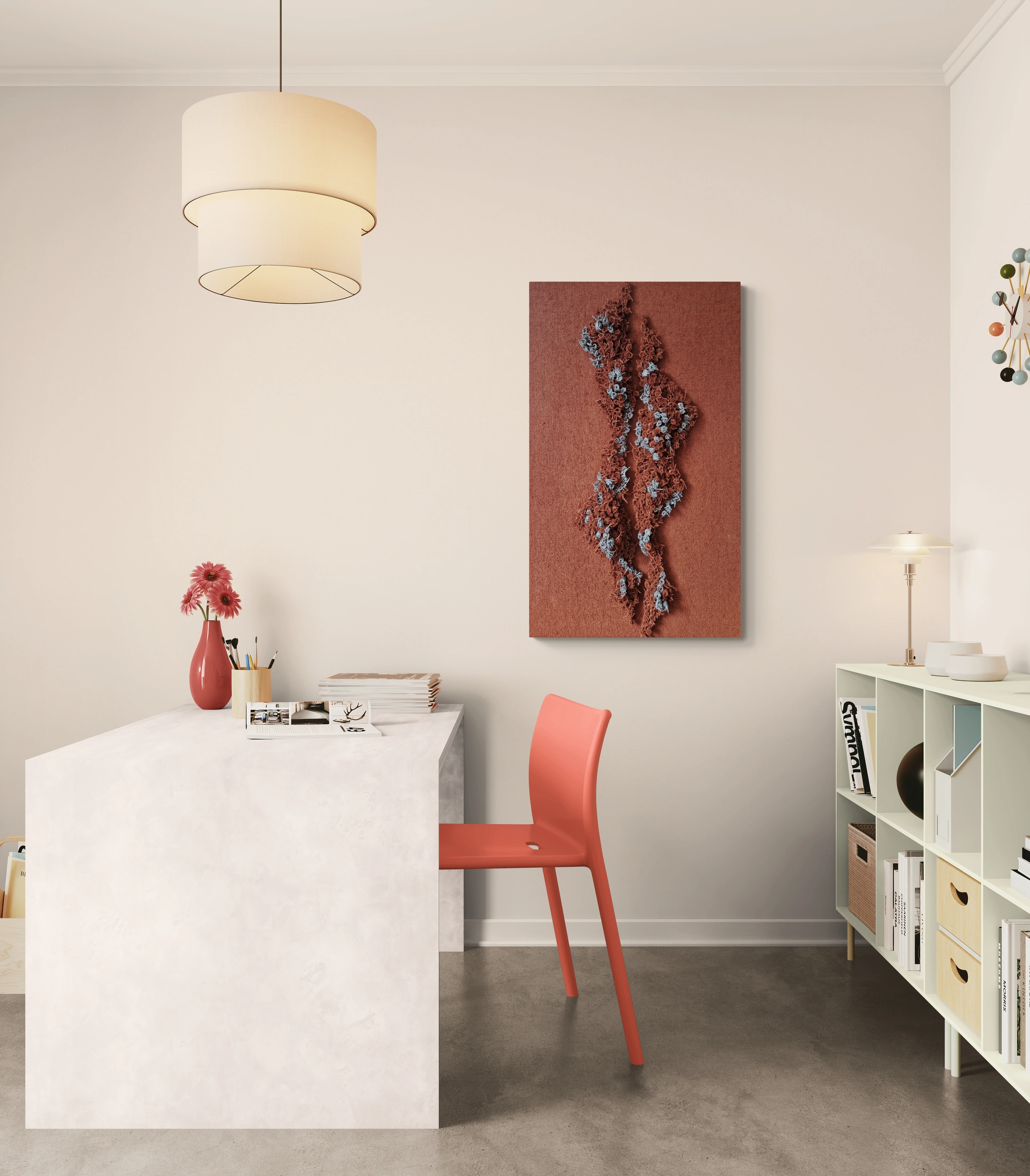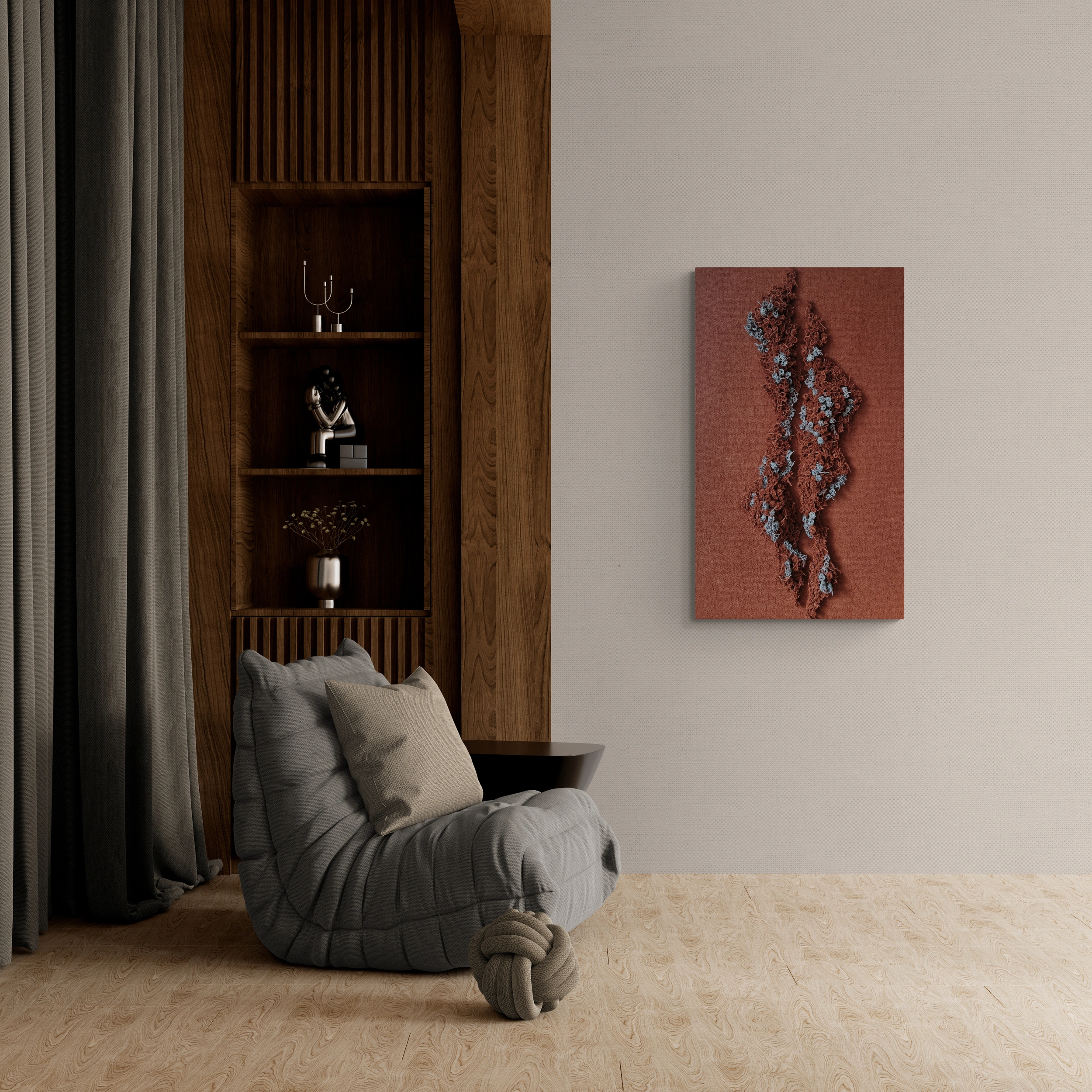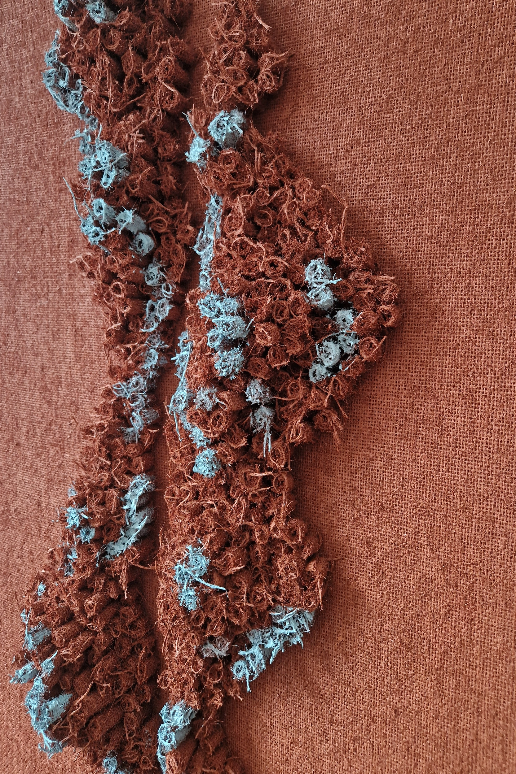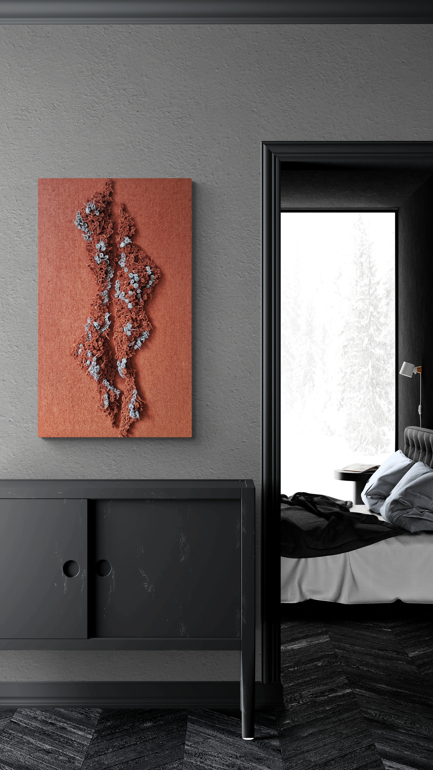 „Tancerze” to tekstylny obraz, który oddaje dynamikę ruchu, emocji i relacji między dwiema postaciami splecionymi w tanecznym geście. Kompozycja opiera się na dwóch organicznych, pionowych formach wykonanych z ręcznie skręcanych fragmentów tkaniny, przypominających ciała w ruchu. Ziemista kolorystyka czerwieni przełamana chłodnymi akcentami błękitu symbolizuje napięcie między siłą a lekkością, ciepłem a dystansem.