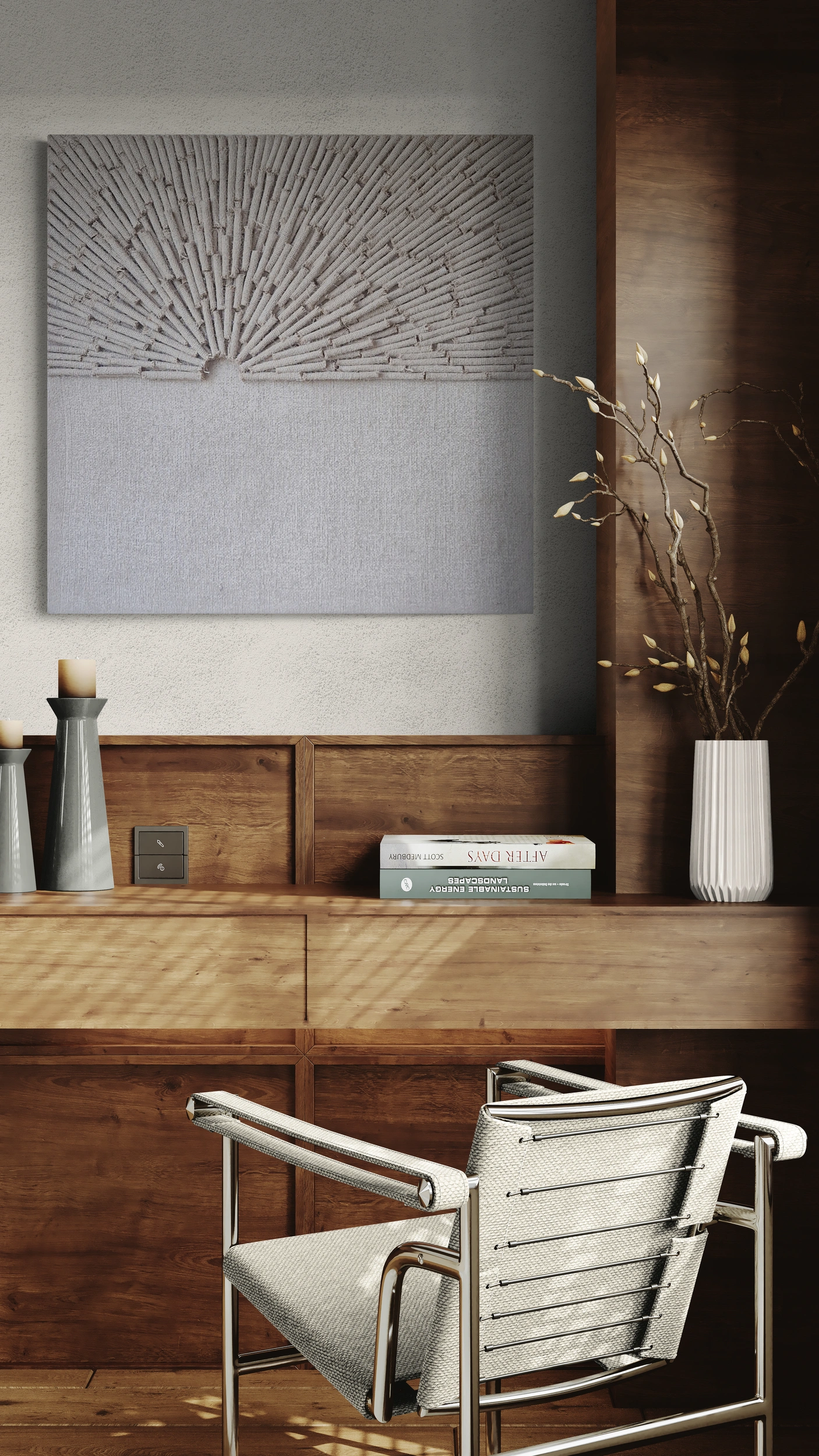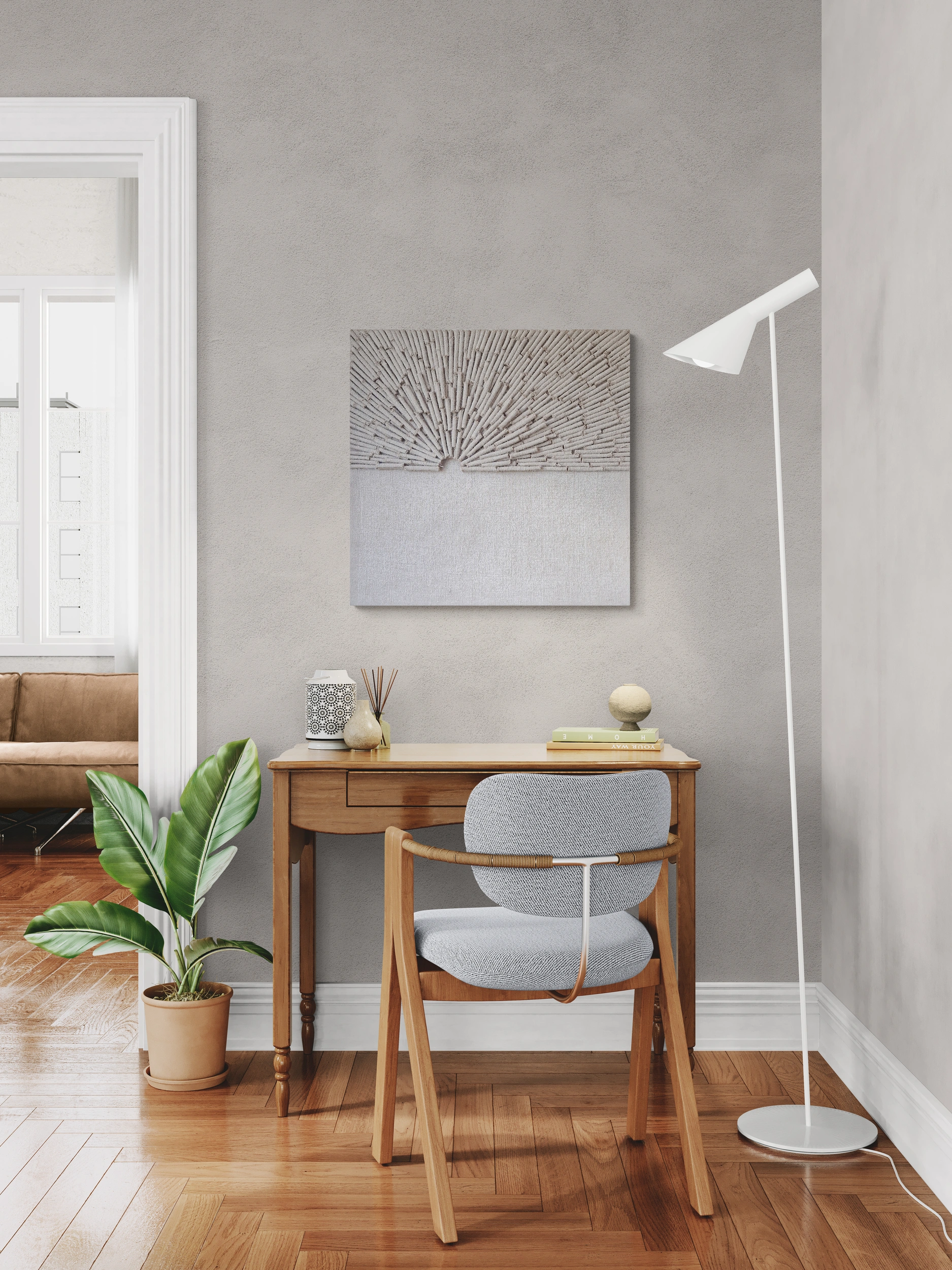 "Wschód Słońca" stanowi silny, ale nienachalny punkt centralny w każdym pomieszczeniu, łącząc naturalne elementy z nowoczesną sztuką. Jego spokojny design wnosi do wnętrza harmonię i równowagę, co czyni go idealnym dodatkiem do przestrzeni, w których ceni się prostotę i subtelne piękno. Ten wszechstronny obraz doskonale wpisuje się w różnorodne style wnętrzarskie: