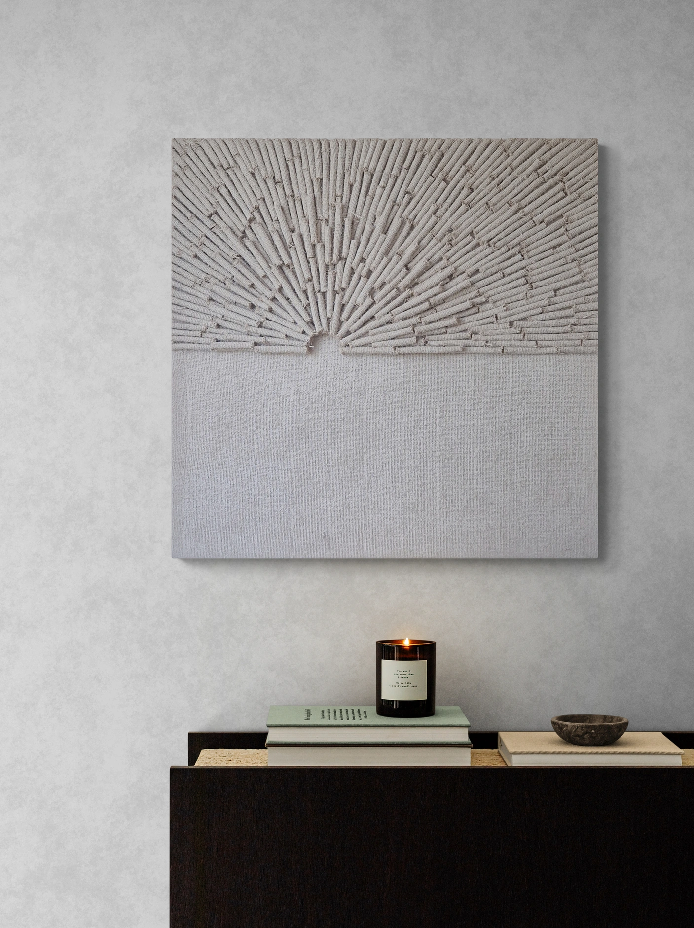 Ten unikalny obraz zatytułowany "Wschód Słońca" został misternie wykonany techniką autorską z tkaniny jutowej. Minimalistyczny, a jednocześnie głęboko ekspresyjny projekt symbolizuje wschodzące słońce, którego promienie rozchodzą się w delikatnych, uporządkowanych liniach w górnej części kompozycji. Szczegółowa faktura dodaje obrazowi trójwymiarowej głębi, tworząc harmonijny kontrast między promienistym wzorem a gładką, niezagospodarowaną dolną częścią. Obraz, malowany natryskowo farbą akrylową, ukazuje subtelne zmiany tonów, podkreślając naturalne piękno użytych materiałów oraz kunszt wykonania.
