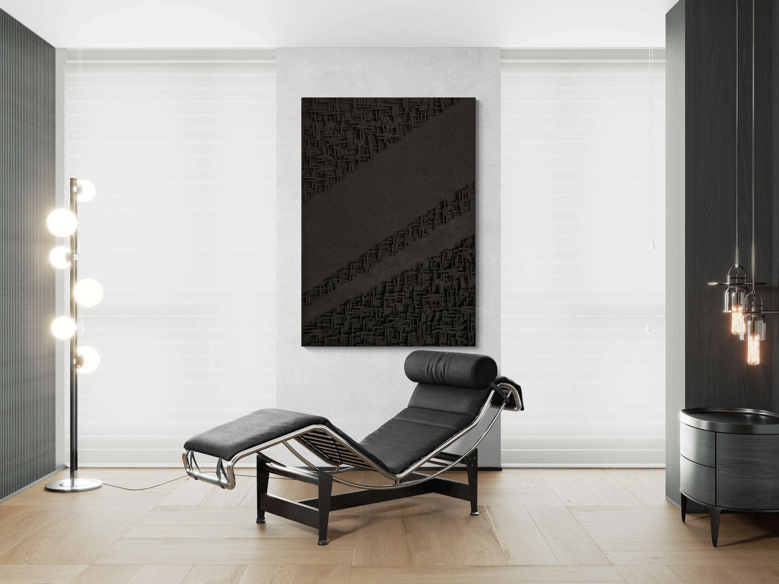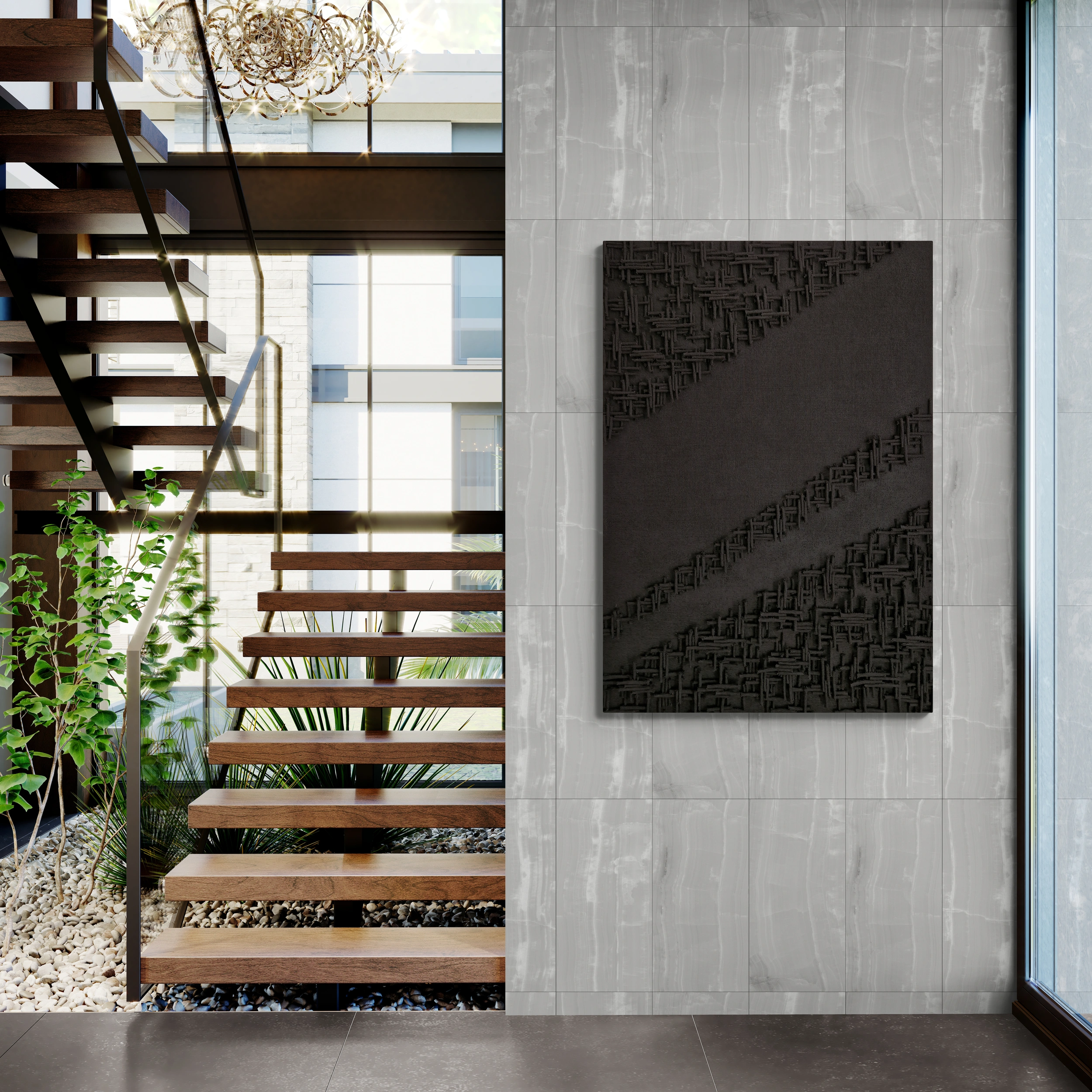Czerń dominująca w obrazie dodaje mu elegancji i wyrafinowania. Faktura juty, przekształcona za pomocą układu pasów, przeplata się z gładkimi powierzchniami, tworząc harmonijny kontrast. Ta minimalistyczna, a jednocześnie dynamiczna kompozycja doskonale pasuje do nowoczesnych wnętrz, szczególnie tych utrzymanych w stylu industrialnym, modernistycznym lub loftowym.