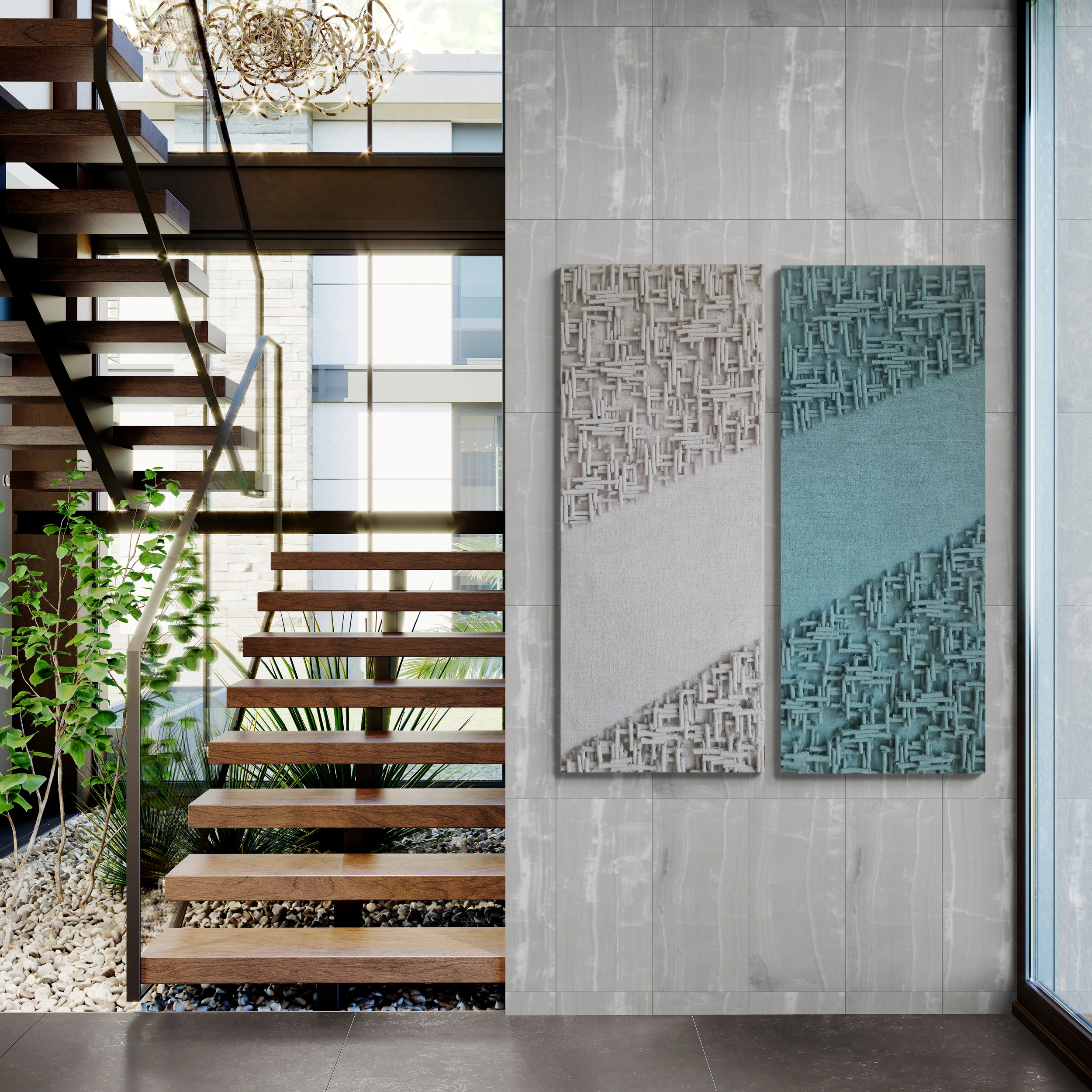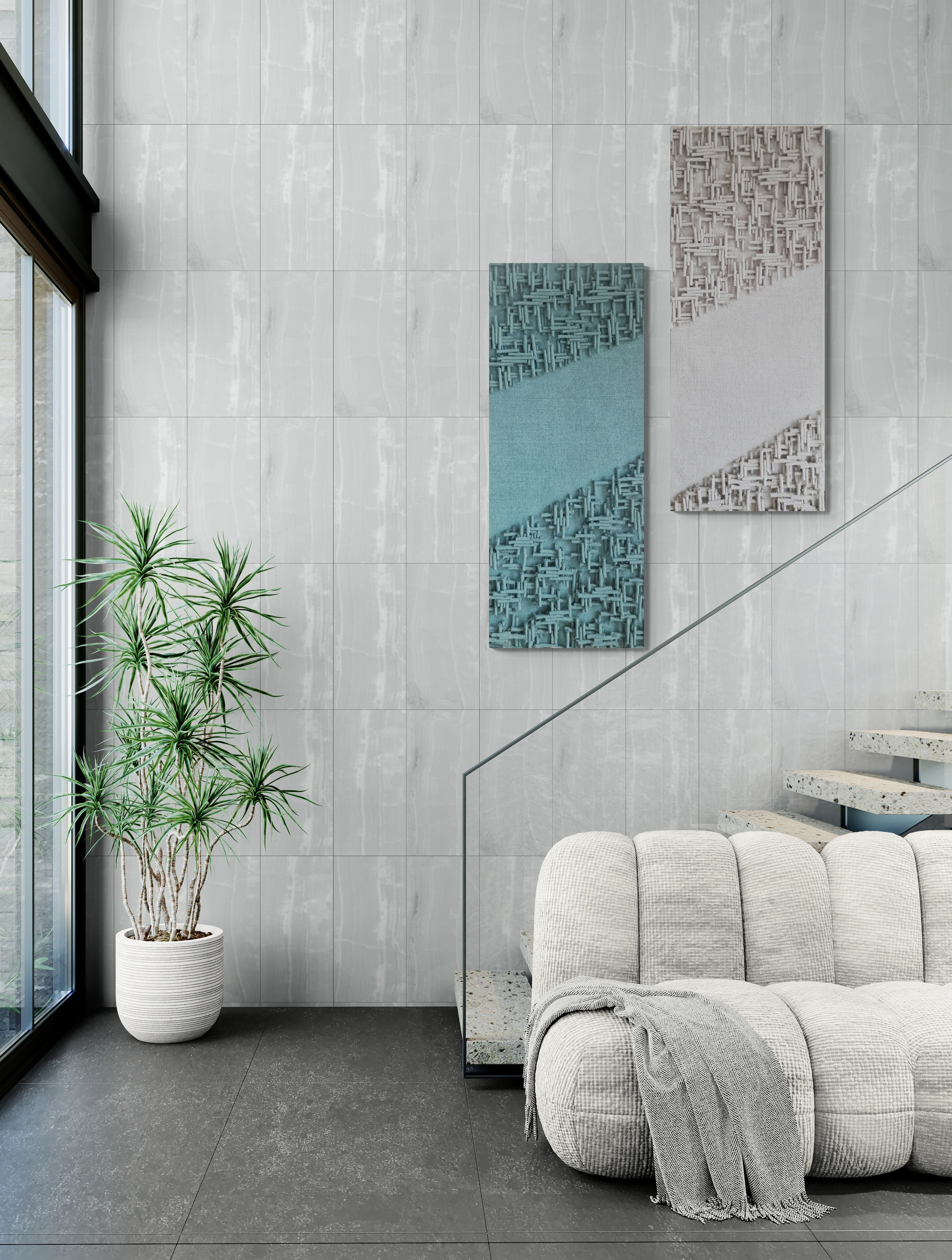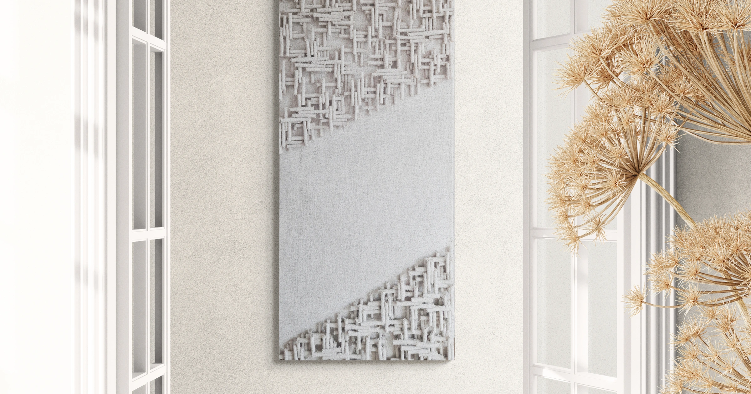 Faktura juty, przekształcona za pomocą układu pasów, przeplata się z gładkimi powierzchniami, tworząc harmonijny kontrast. Ta minimalistyczna, a jednocześnie dynamiczna kompozycja doskonale pasuje do nowoczesnych wnętrz, szczególnie tych utrzymanych w stylu industrialnym, modernistycznym lub loftowym.