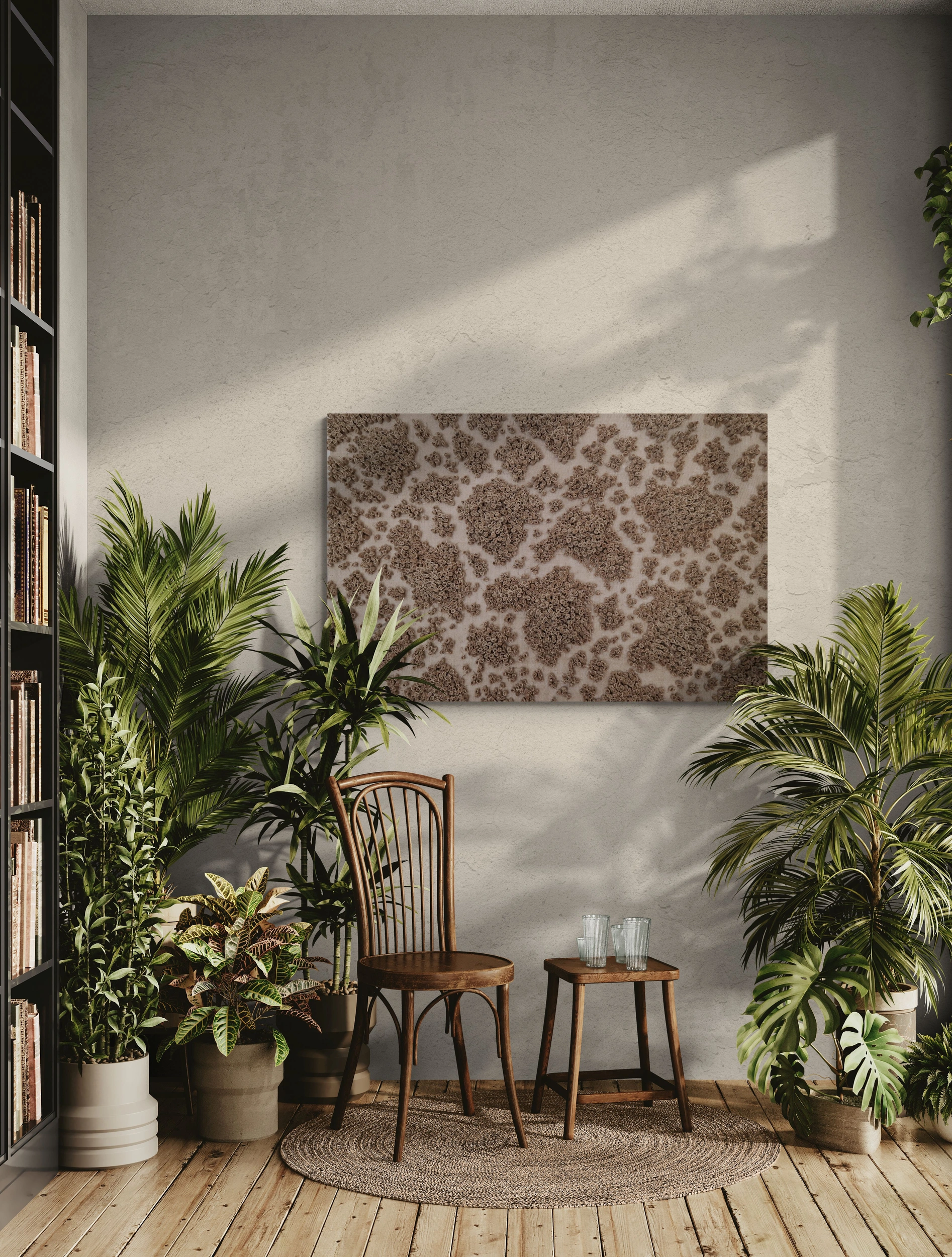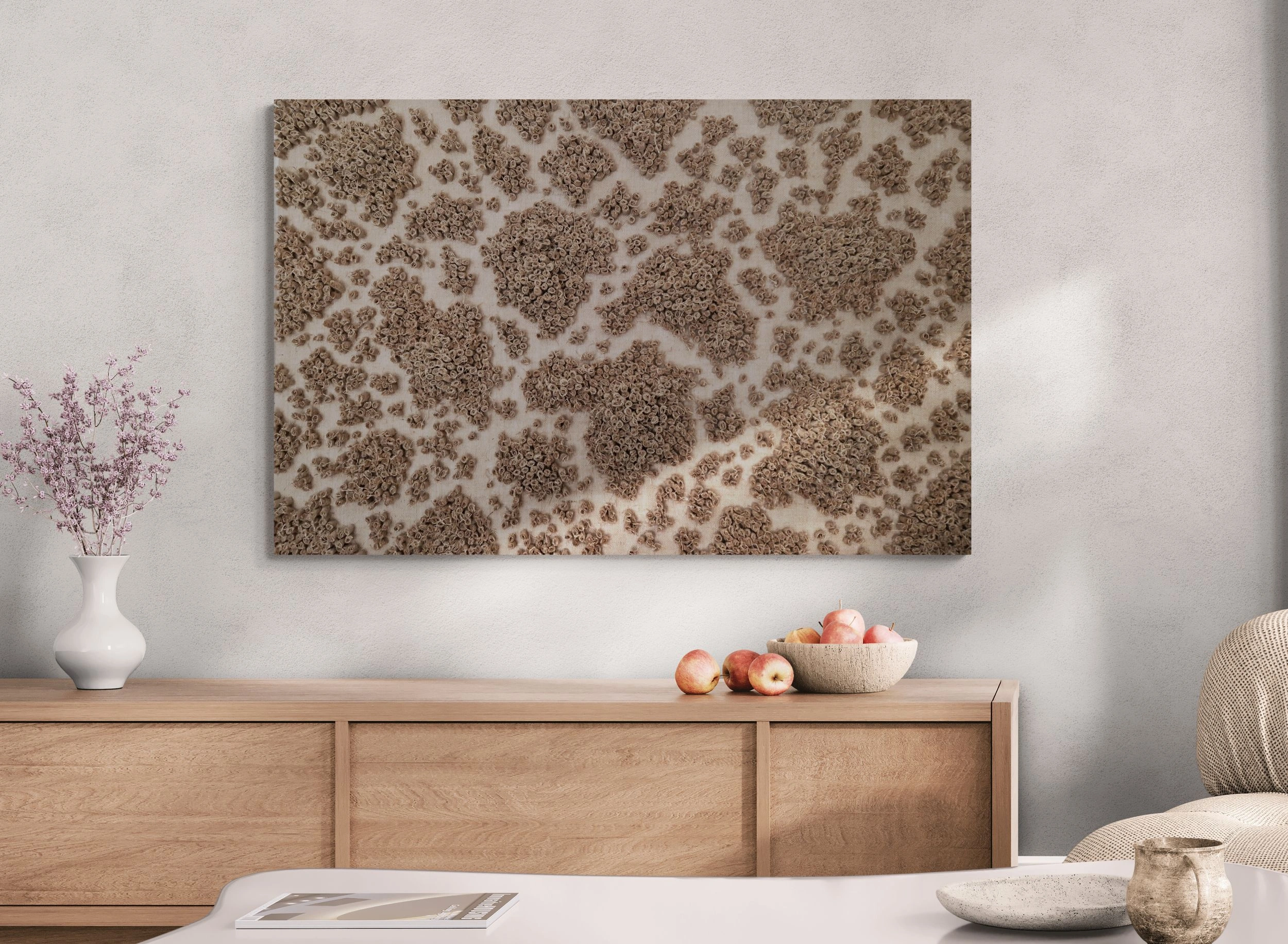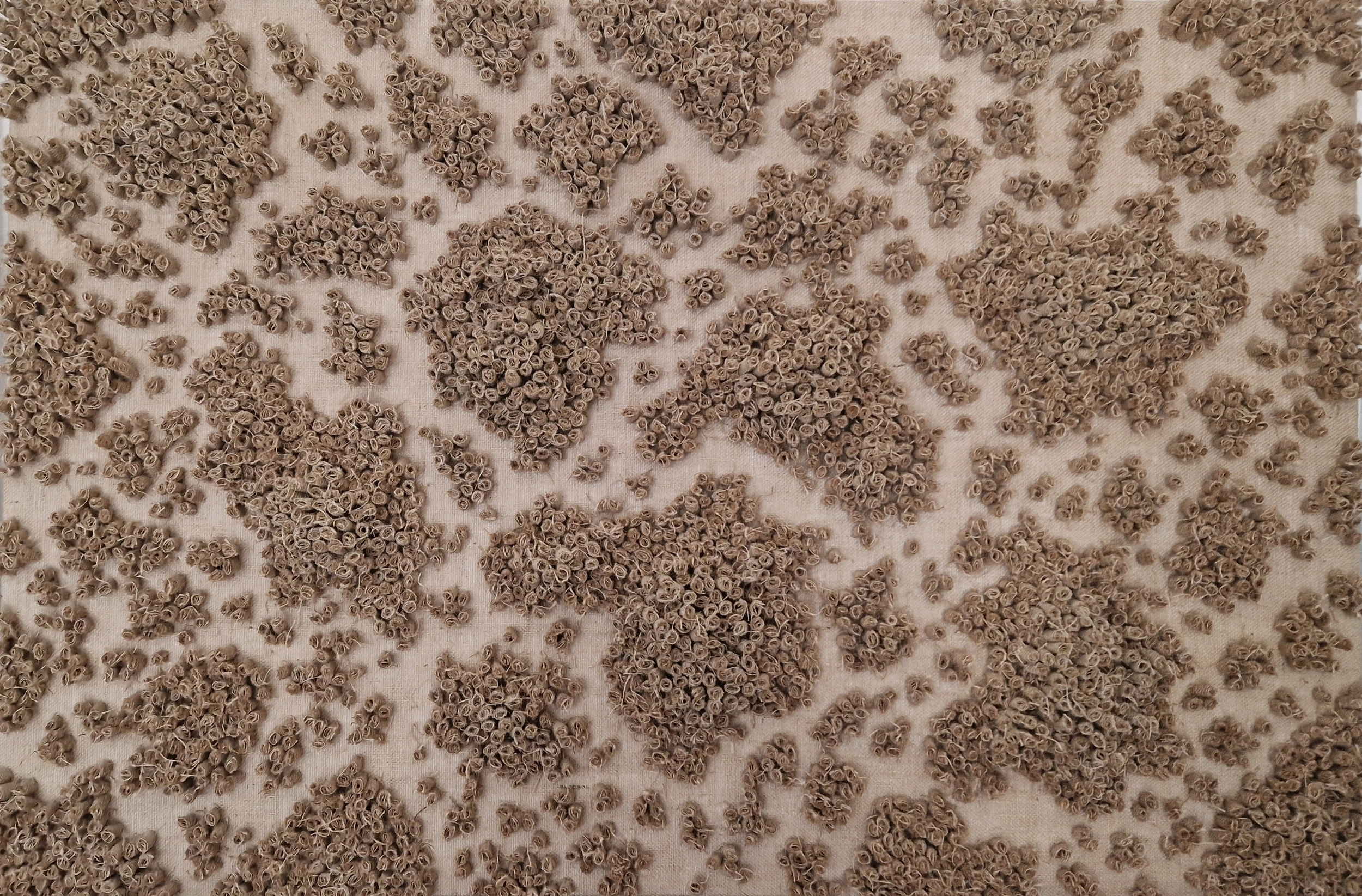 Obraz „Echo Bagien” to autorska kompozycja, w której naturalność materiału spotyka się z organiczną formą i subtelną strukturą. Dzieło wykonane zostało w całości z tkaniny jutowej - zarówno podłoże, jak i nieregularne, wypukłe elementy powstały z misternie układanych fragmentów tej samej tkaniny. Tworzą one trójwymiarową, fakturalną powierzchnię, przywodzącą na myśl naturalne struktury: porosty, mchy czy powierzchnię bagien.