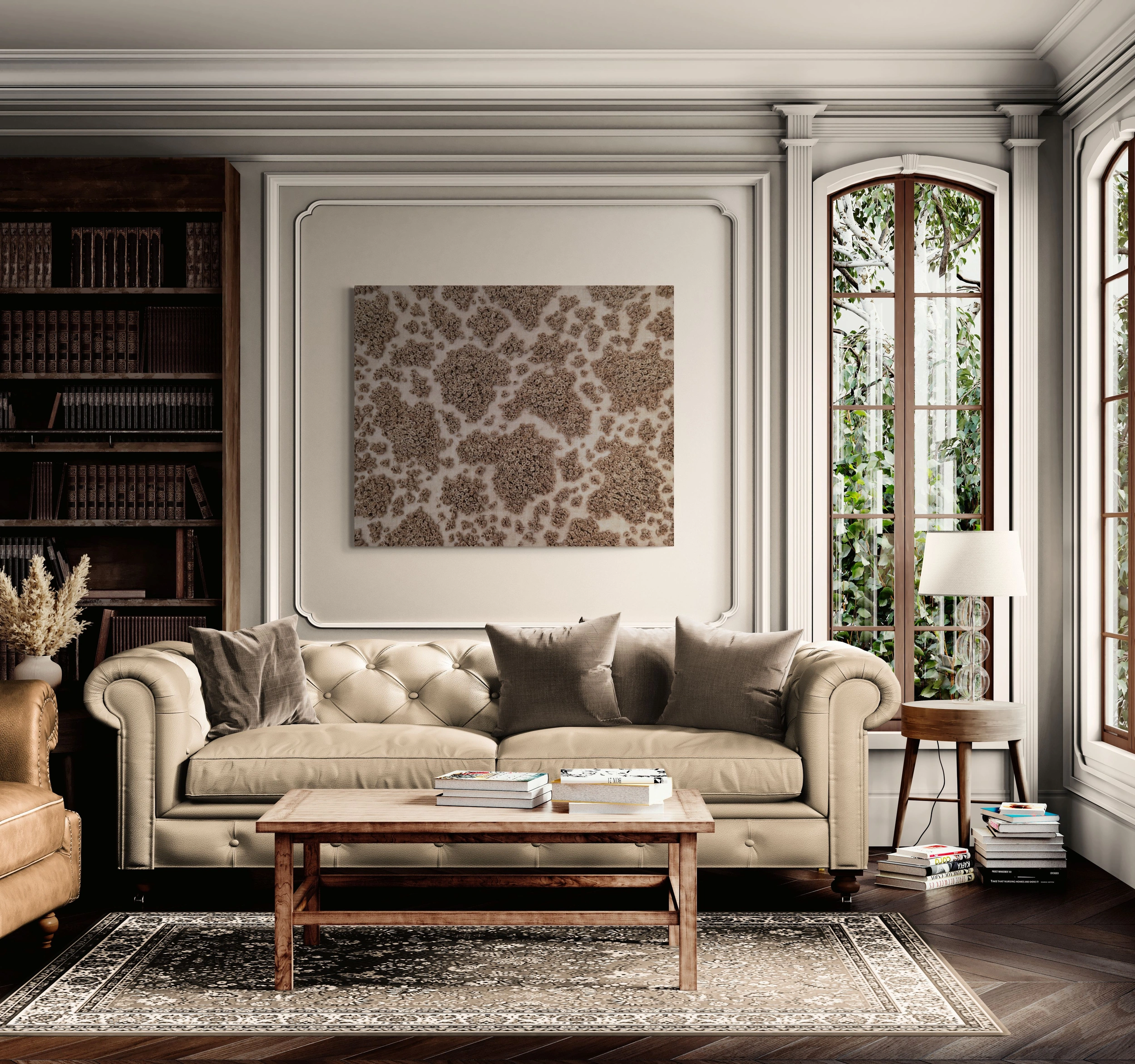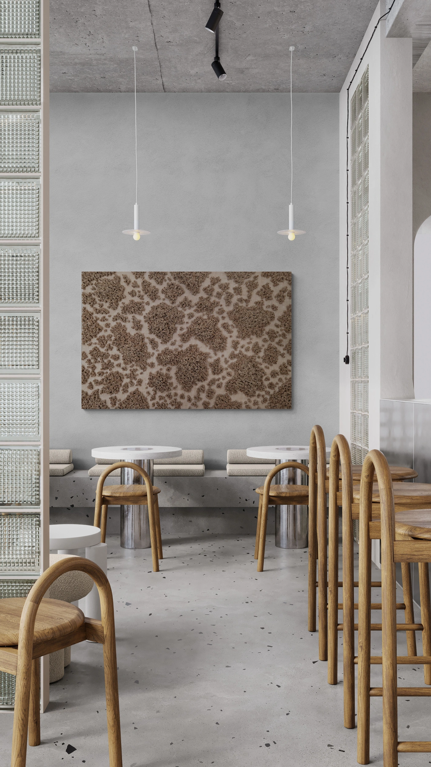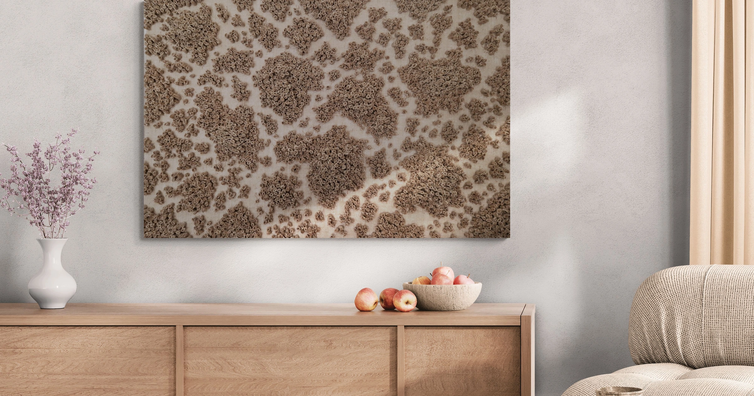 Ziemista kolorystyka i surowa faktura juty nadają kompozycji spokój i autentyczność. Subtelna gra światła i cienia na chropowatej powierzchni ożywia dzieło, podkreślając jego organiczny rytm i głębię. „Echo Bagien” wprowadza do wnętrza atmosferę harmonii i bliskości z naturą, stanowiąc jednocześnie elegancki, współczesny akcent dekoracyjny.