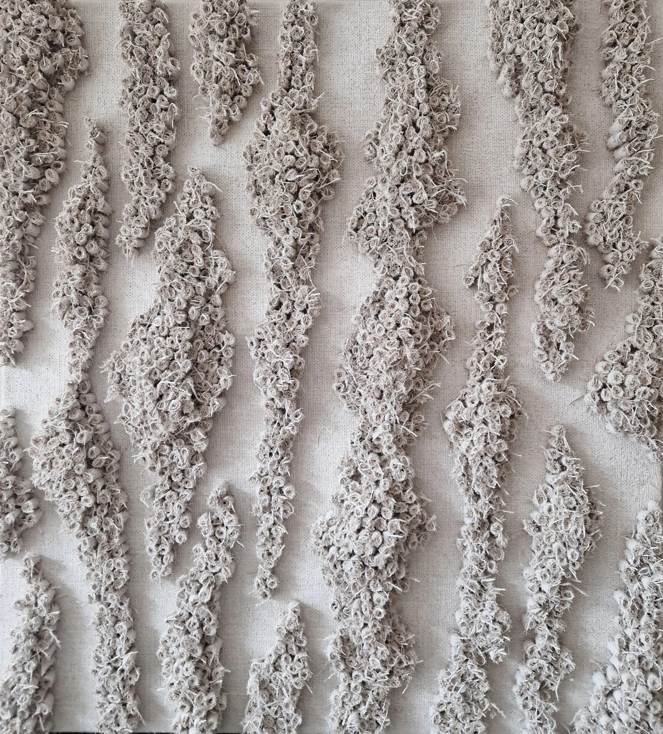 Obraz „Rozlewisko” to subtelna, harmonijna kompozycja inspirowana naturalnym rytmem wody i ruchu natury. Wykonany w całości z tkaniny jutowej, której strukturalne elementy zostały ręcznie uformowane i następnie delikatnie pokryte białą farbą, zyskuje wyjątkową głębię i lekkość. Miękkie, pionowe formy przywodzą na myśl ścieżki wody rozlewające się po powierzchni, tworząc wrażenie płynności i spokoju.