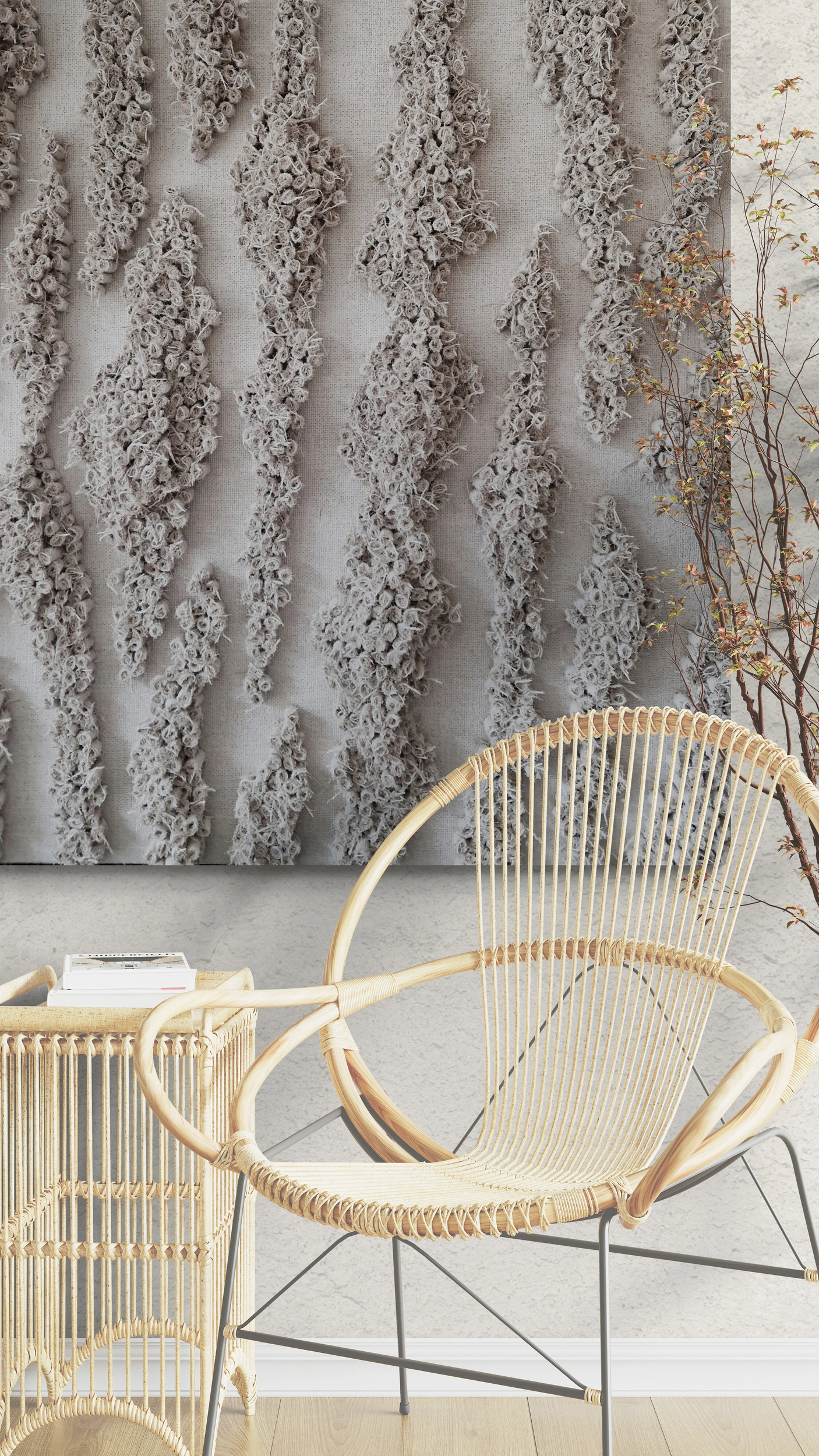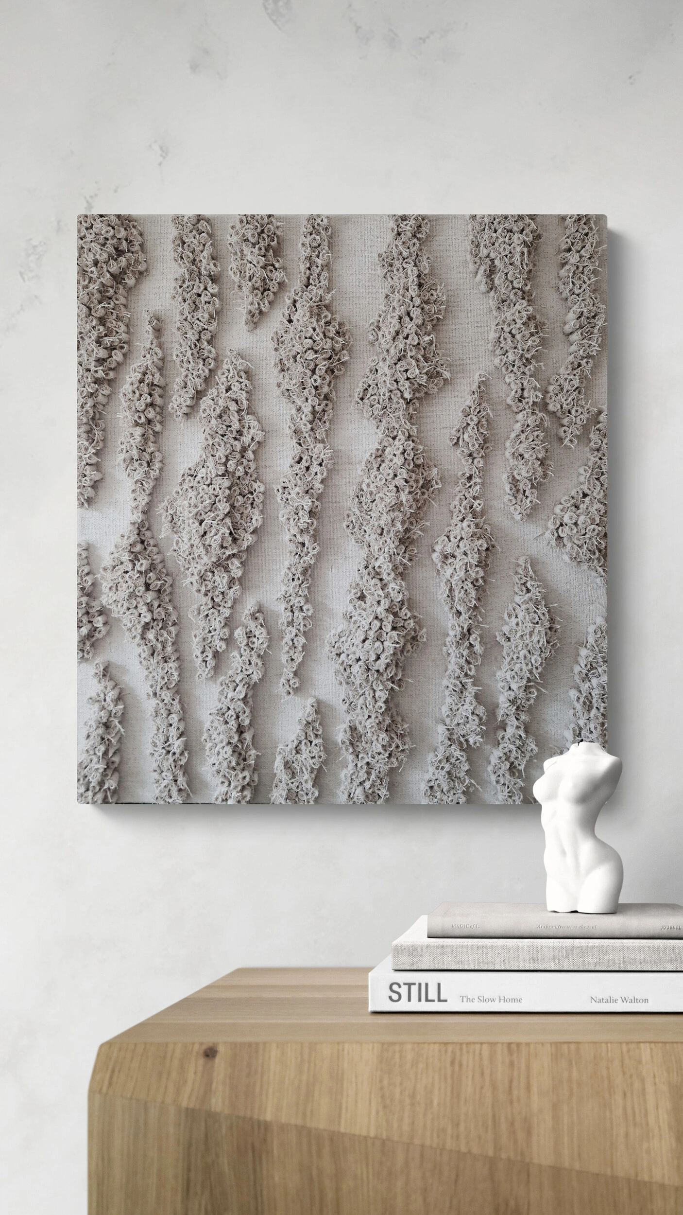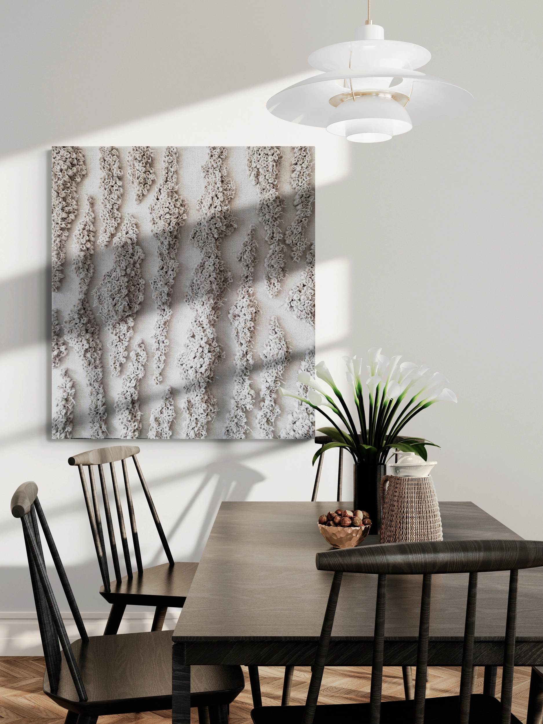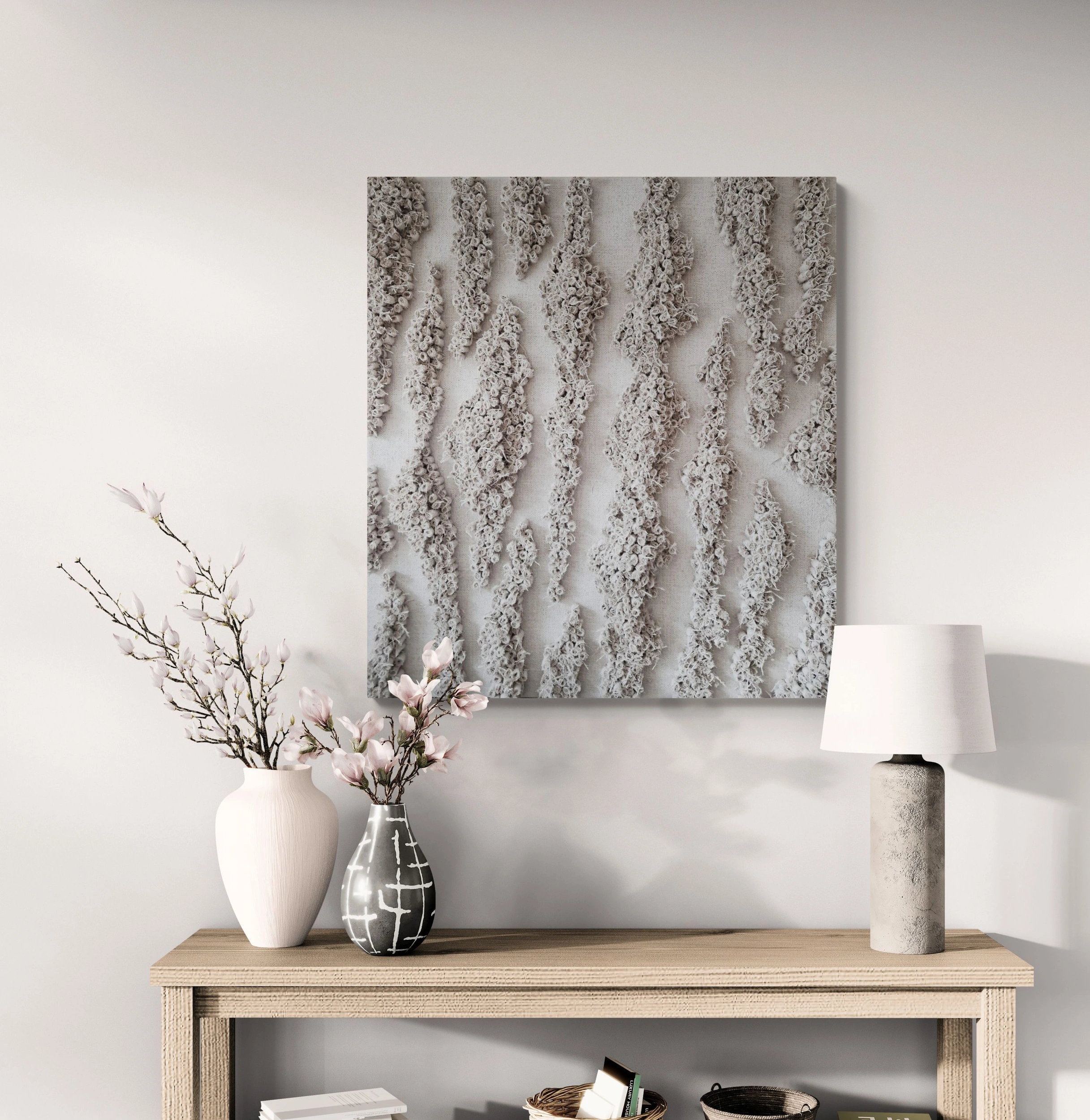 Połączenie surowej juty z jasną, rozbieloną tonacją sprawia, że obraz zyskuje niezwykle subtelny, niemal medytacyjny charakter. Gra światła na wypukłej fakturze ożywia powierzchnię, podkreślając naturalny rytm i organiczne detale. „Rozlewisko” wprowadza do wnętrza atmosferę ciszy, równowagi i harmonii, będąc jednocześnie eleganckim, współczesnym akcentem dekoracyjnym.