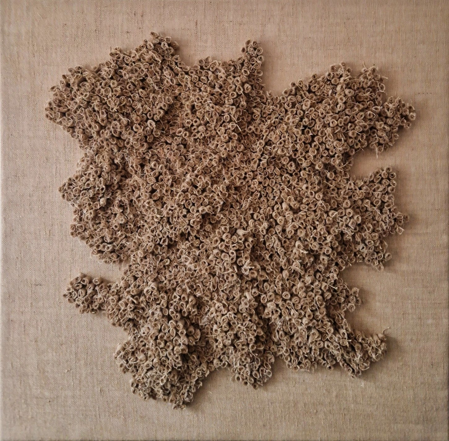 Obraz „Samotna wyspa” to minimalistyczna, a jednocześnie wyrazista kompozycja, w której naturalność materiału odgrywa kluczową rolę. Dzieło wykonane zostało w całości z tkaniny jutowej - zarówno podłoże, jak i centralny, trójwymiarowy element utworzony z misternie formowanych fragmentów tej samej tkaniny. Surowe włókna juty nadają kompozycji organiczny rytm i fakturę, przywodzącą na myśl kształt samotnej wyspy unoszącej się na spokojnej powierzchni.