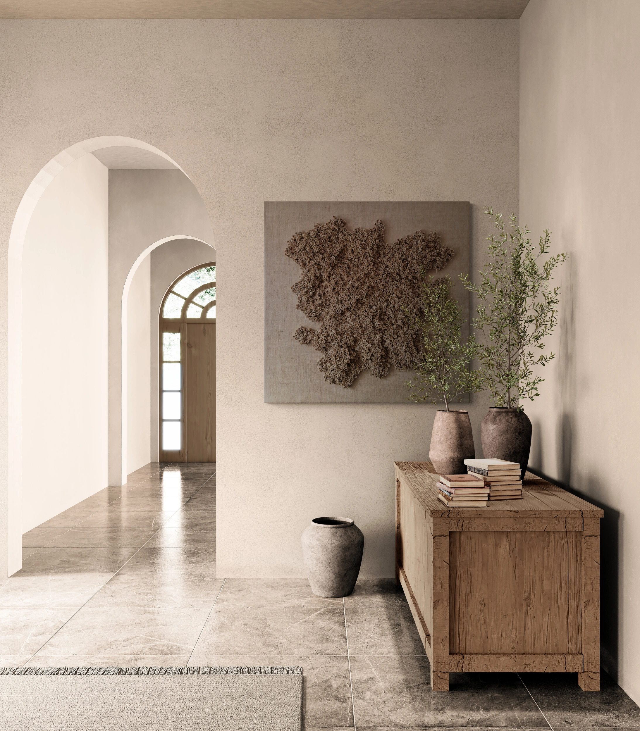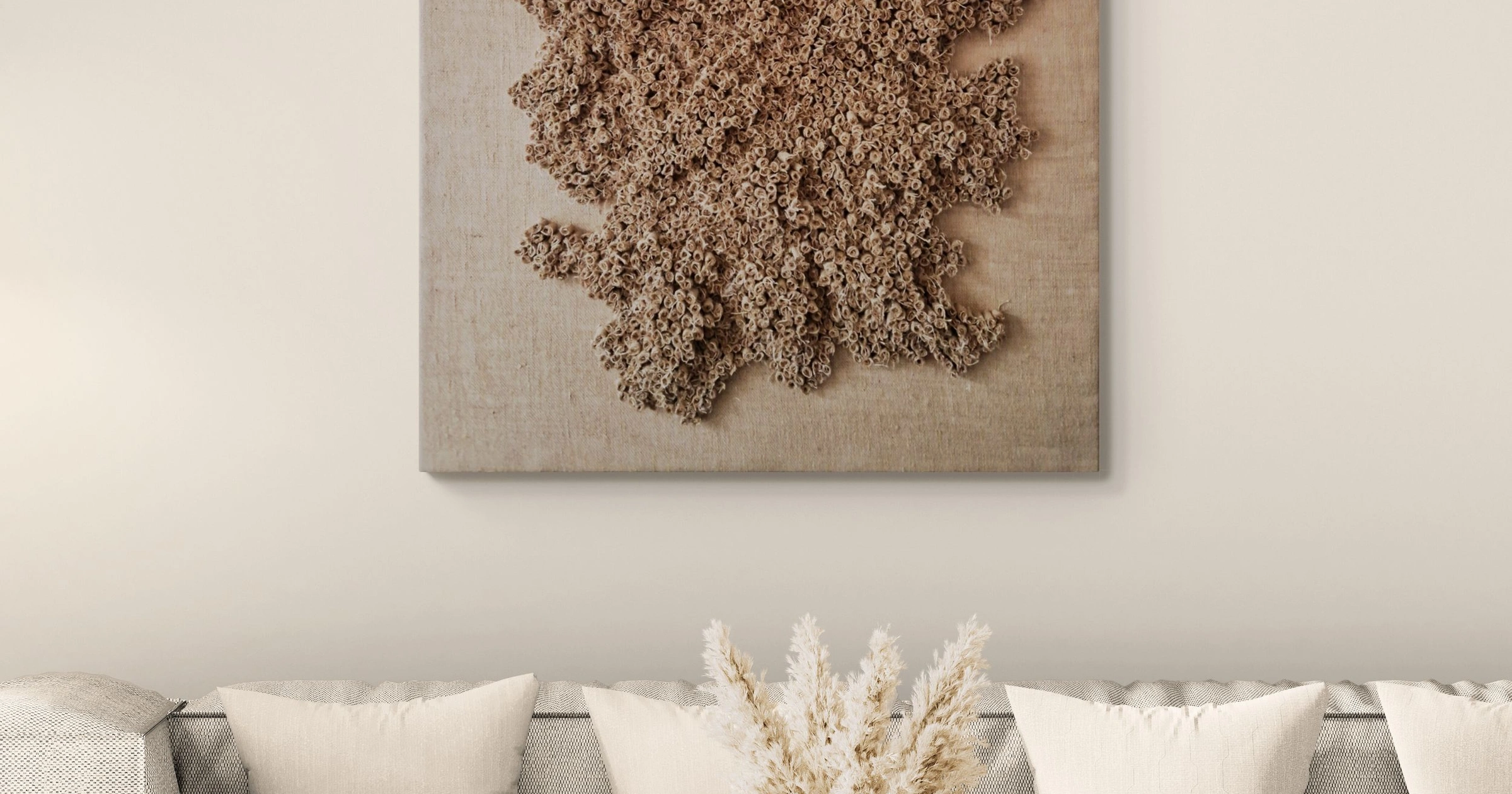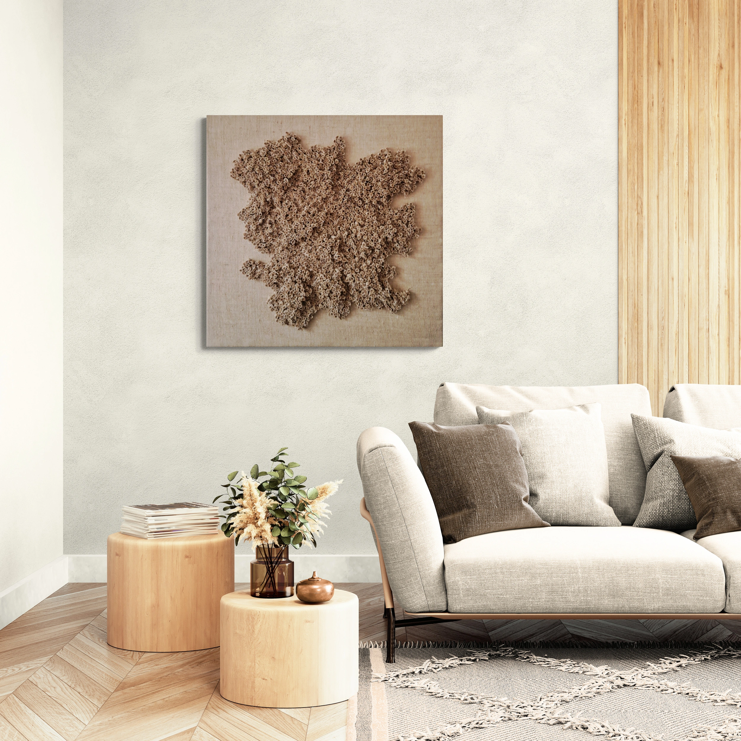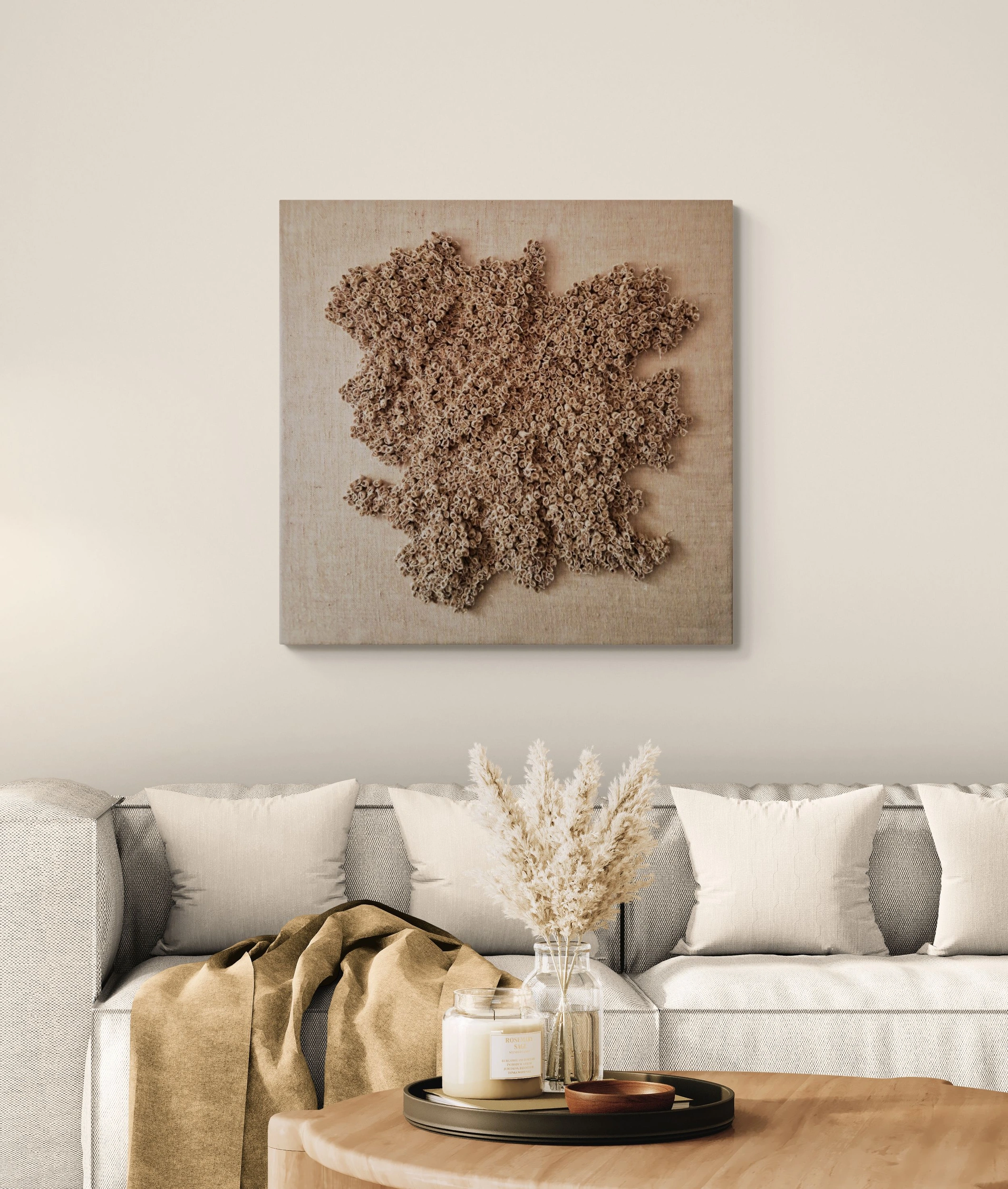 Ziemiste odcienie beżu i brązu podkreślają naturalny charakter obrazu, a gra światła na zróżnicowanej strukturze ożywia jego formę, wprowadzając subtelną głębię i miękkość. „Samotna wyspa” emanuje spokojem i prostotą, stając się jednocześnie punktem skupienia i elementem kontemplacji we wnętrzu.